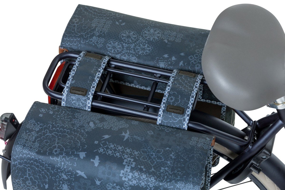 De Basil Bohème Double Bag is een dubbele blauwe fietstas met een stijlvolle bohemien print. Een fietsrit naar de supermarkt of een fietstrip met vriendinnen, deze fietstas maakt jouw fietsrit makkelijker en leuker. De groene tas heeft een inhoud van 35 liter waardoor je er meer dan genoeg boodschappen, sportspullen en andere benodigdheden in kwijt kan. De fietstas is geschikt voor diverse bagagedragers (ook e-bikes) en beschikt over stevige binnenvoering en kunstlederen details. Met behulp van het aansnoerkoord en de verstelbare kliksluitingen sluit de tas. Door het waterafstotende polyester blijft de inhoud van de tas droog bij een kleine regenbui. De reflectiedetails op beide kanten zorgen ervoor dat je beter zichtbaar bent in het donker. Dankzij het Universal Bridge systeem bevestig je de tas eenvoudig op je bagagedrager. Ook op de bagagedrager van je elektrische fiets. Het Universal Bridge systeem bestaat uit vier gleuven. Deze gleuven maken het mogelijk om de tas op twee manieren te bevestigen: