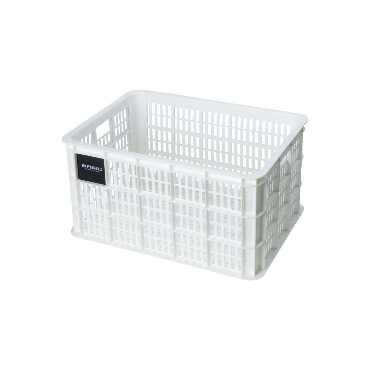 Basil fietskrat L, gerecycled kunststof, groot formaat, incl. kratclicker, geschikt voor MIK, Racktime, I-Rack, MonkeyLoad en AtranVelo platen (apart verkrijgbaar), excl. bev. materiaal, max. gewicht afhankelijk van max. toelaatbaar gewicht drager, 40L, white. Afmetingen: 38 x 49 x 26 cm