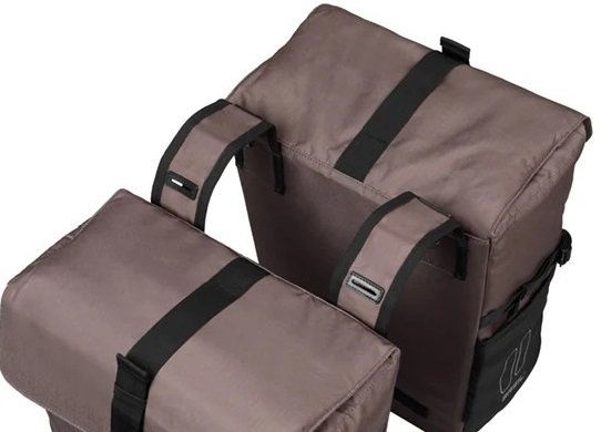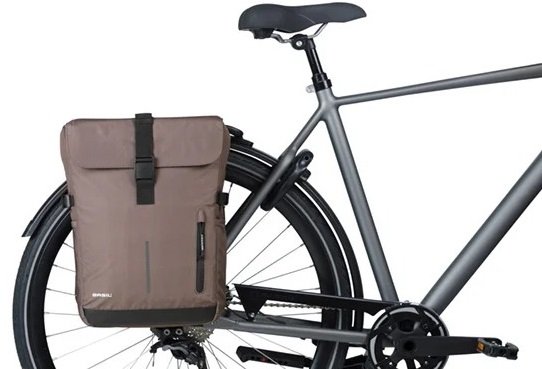 Basil Move dubbele fietstas, waterafstotend gerecycled polyester, elastische zijvakken, extra ritsvakken, incl waterproof regenhoes, Universal Bridge system (geschikt voor MIK, Racktime platen (apart verkrijgbaar), reflectie, 30L, bruin