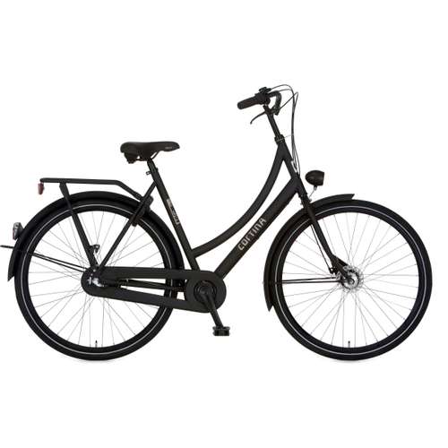 Cortina U1 damesfiets in framemaat 57cm. Kleur: Black Matte. Uitgerust met achter een Shimano Nexus 3-traps versnellingsnaaf met rollerbrake en voor een Shimano naaf met rollerbrake.