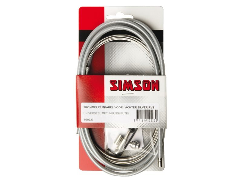De Simson Trommelremkabelset universeel grijs is een complete trommelremkabelset. De set bestaat uit een grijze kleurige buitenkabel en een roestvrijstalen binnenkabel van 2,25 meter met universele ton- en peernippel. De set wordt geleverd inclusief inbussleutel en bevestigingsmateriaal. Knip de nippel die niet van toepassing is af. Steek de binnenkabel door de buitenkabel en sluit de binnenkabel aan op de rem. Stel de rem af en knip de binnenkabel A?? 2 cm voorbij schroefnippel af. Omdat de remkabelset universeel is, kunnen er onderdelen overblijven.